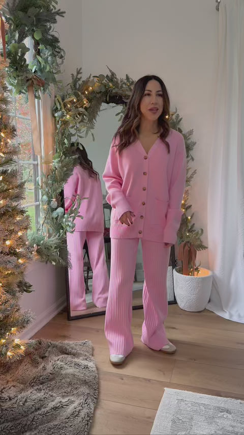 Obsessed! Our Brianna Pants in Pink are the style staple your wardrobe needs. We love the allover ribbed knit on these, complete with a classic wide-leg silhouette. Pair this cozy knit with our matching Brianna Cardigan and add neutral flats or sneakers to complete your look — the perfect lounge option for the seasons ahead.