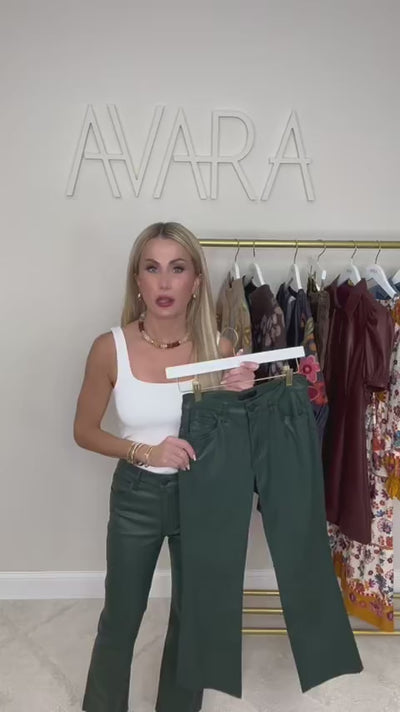 The perfect statement denim! Our Kelsey Wax-Coated Jeans in Forest are a must-have. Made of an ultra-lightweight and soft fabrication that's perfect for cooler weather, this style fits and flatters. An inset panel in the inner leg creates the perfect flare silhouette. The perfect option for day-to-night wear all season long.
